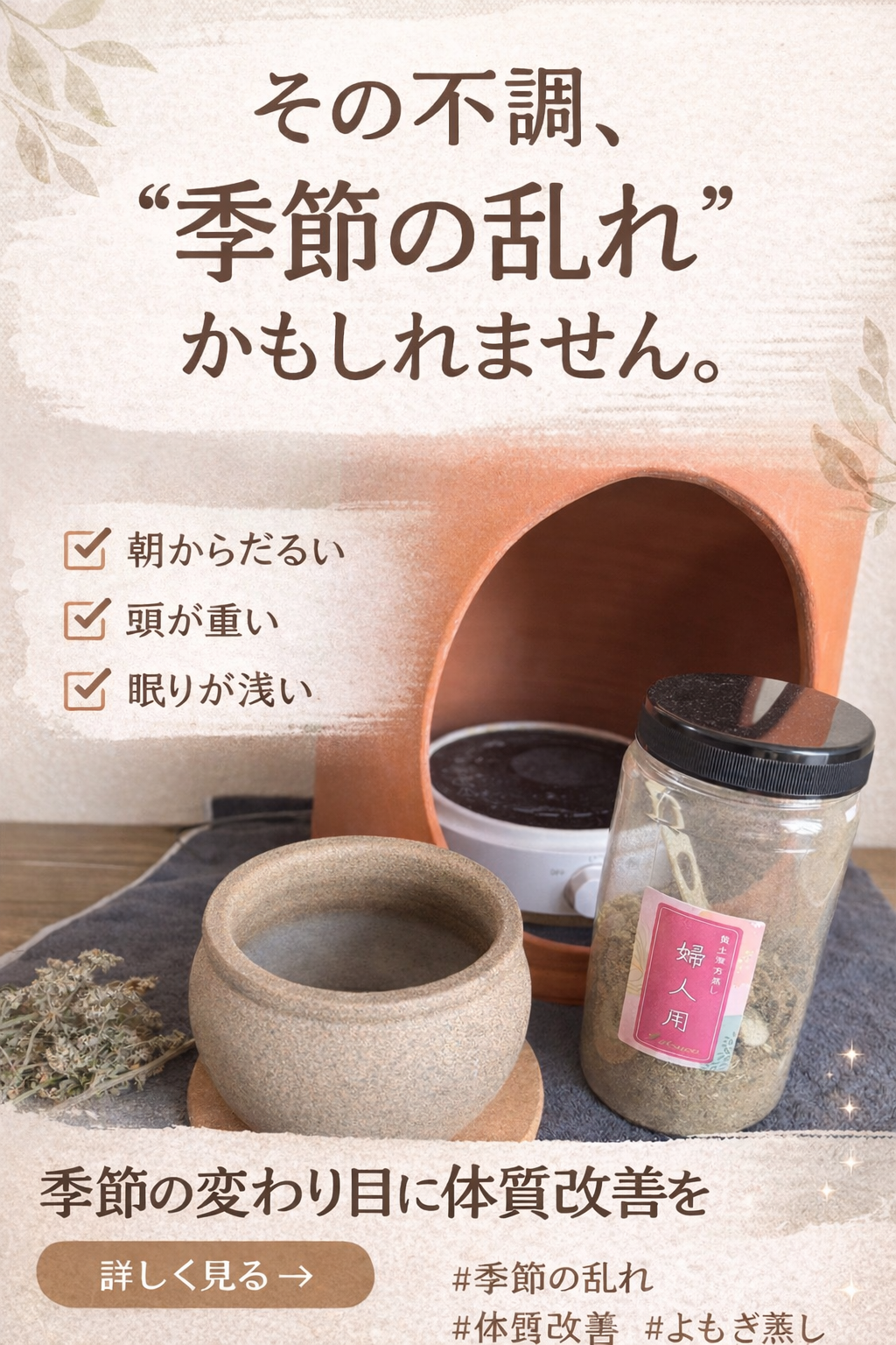 よもぎ蒸しは、体の内側からじんわりと温め、滞った巡りを促します。